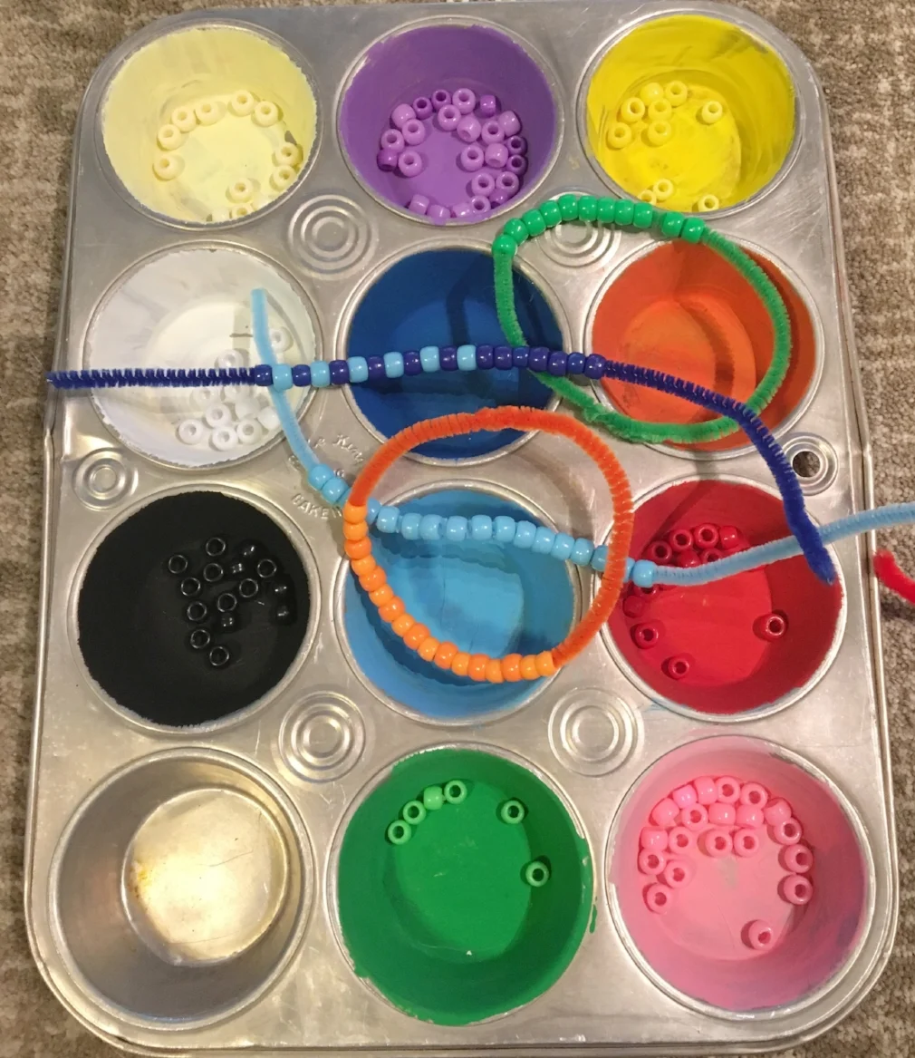 5. Start by matching beads into compartments by color. Let it evolve into picking up the beads with the scoopers or tweezers, threading pipe cleaners, making jewelry, making patterns, etc.